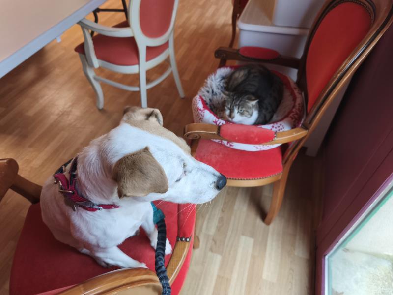 Sherlock aime les chats.... surtout pour jouer! Ce qui n'est pas toujours du goût de Tigrou, le félin de la résidence. Cependant, Sherlock a du se résigner, et vivre en bonne entente avec lui, chacun respectant les intentions de l'autre. Les débuts furent houleux, maintenant c'est du passé, et ils s'entendent "comme chien et chat", dans la paix et le calme.