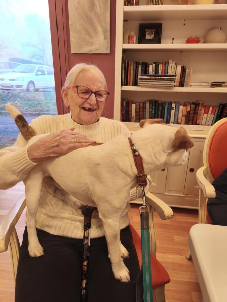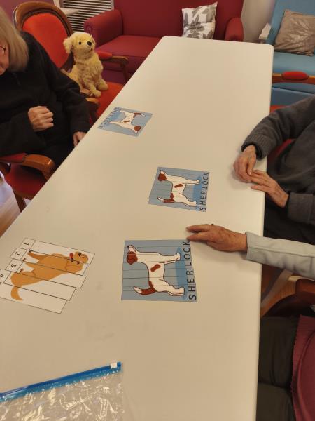Aujourd'hui, Sherlock a décidé de faire le pitre, et de s'inviter sur les genoux des résidentes. Ce qui a déclenché quelques fou-rires bienvenus, et ainsi créer une ambiance gaie pour commencer l'activité. Puis la concentration a été de mise pour résoudre les puzzles proposés, et la fin de séance a permis à Sherlock de retrouver un poil brillant et doux grâce à un toilettage complet .