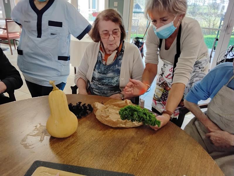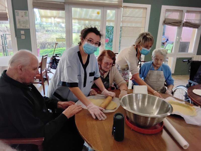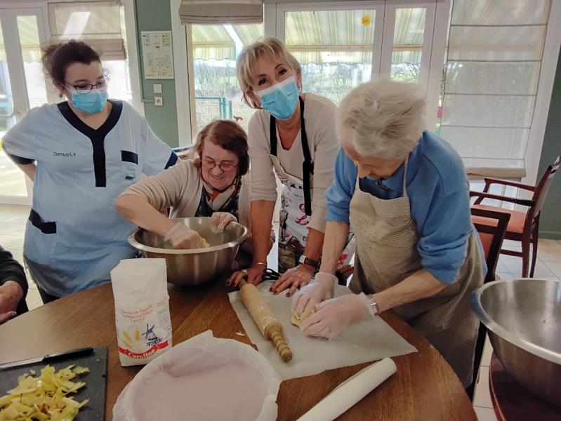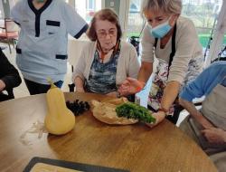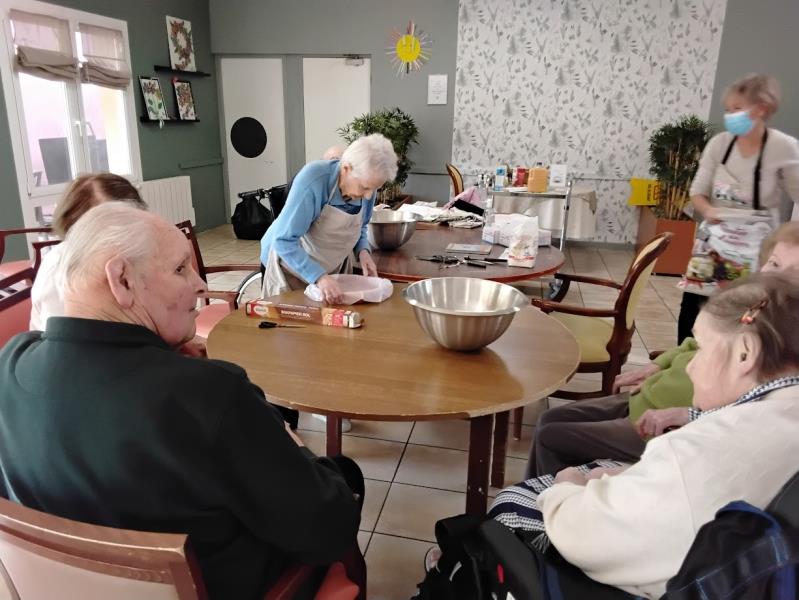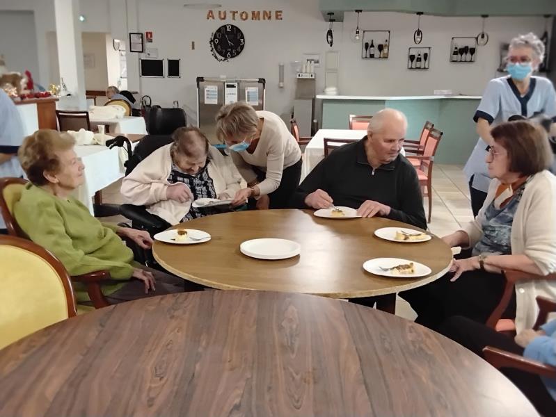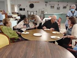 Un moment convivial et gourmand avec neuf résidents , animé en présence de Valérie, diététicienne, Céline, aide-soignante, et Sandrine, animatrice.
