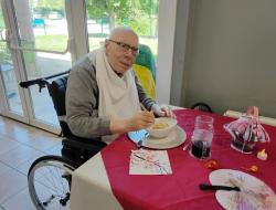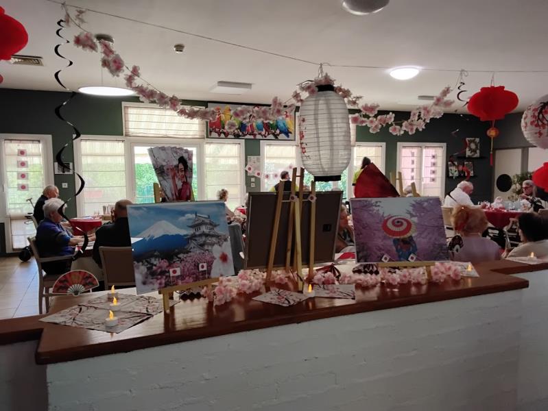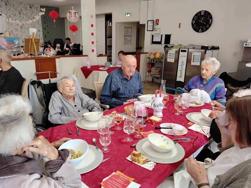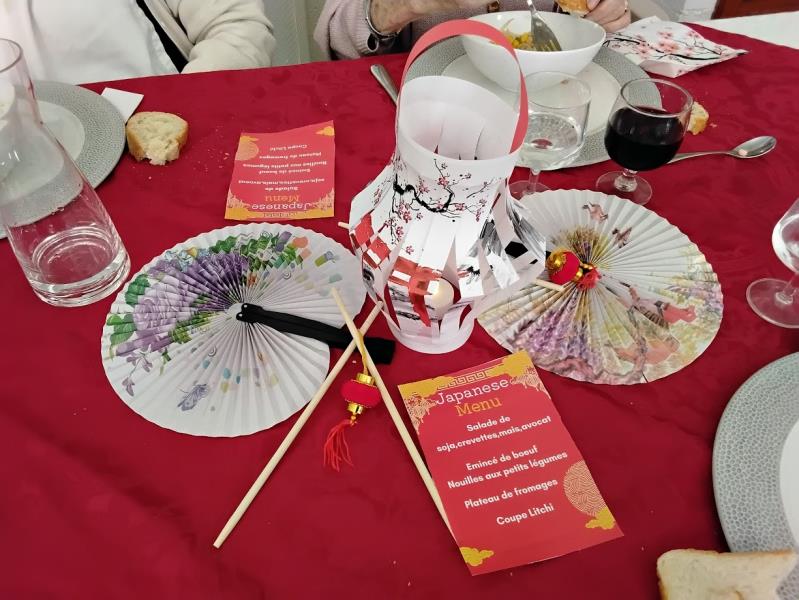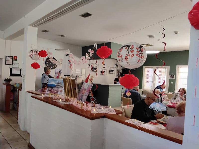 Un doux parfum d’évasion s’est invité à la résidence le temps d’un repas thématique placé sous le signe du Japon. Dès l’entrée dans la salle de restauration, les résidents ont été transportés dans une atmosphère apaisante et élégante, inspirée de la culture nippone. Les tables, soigneusement dressées, mêlaient sobriété et raffinement : nappes aux teintes délicates, touches de rouge et de noir, petits éventails décoratifs, baguette, fleurs de cerisier et lanternes créaient un décor harmonieux et dépaysant.